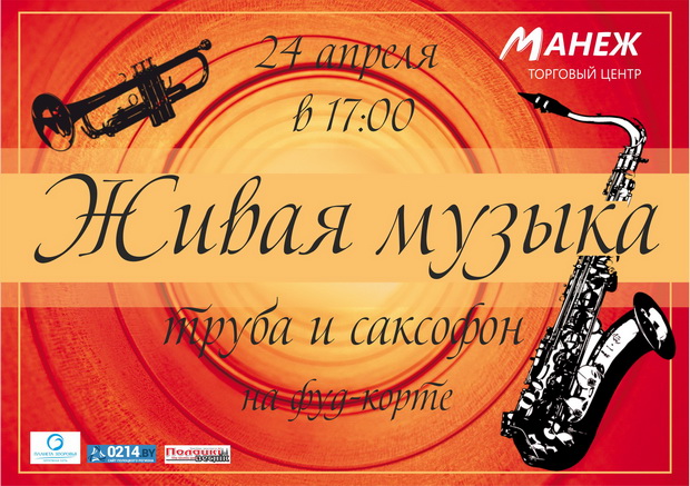 Мы снова будем рады видеть вас в 24 апреля в ТРЦ «Манеж» в 17.00 на футкорте на нашем воскресном концерте инструментальной музыки. Дуэт саксафона и трубы многие ценители инструментальной музыки считают музыкой для души. Если хотите провести этот вечер в отличной компании приходите к нам в ТРЦ «Манеж»! Будем рады новой встрече с Вами!