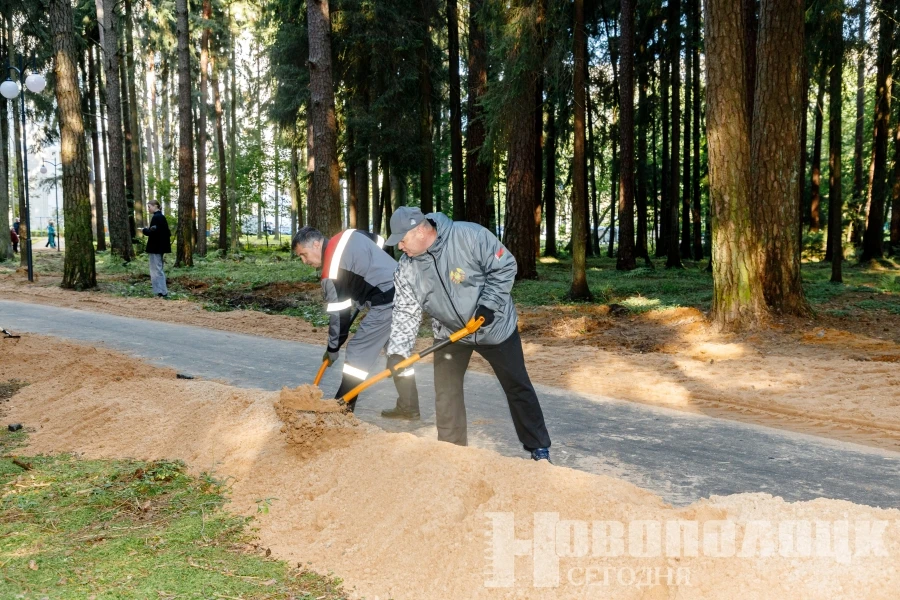 Основные работы были направлены на благоустройство лесопарковой зоны напротив гостиницы «Нафтан». В субботнее утро 23 августа здесь трудились более 150 человек из числа сотрудников горисполкома, ОАО «Нафтан», завода «Полимир», Биомехзавода бытовых вторресурсов, Новополоцкводоканала, Треста-16, ОАО «Измеритель», жилищно-коммунального хозяйства. Помимо традиционной уборки опавших сучьев и листвы, участники акции взялись за укрепление дорожного покрытия. Уложенный по обочине песок значительно улучшит состояние и износостойкость асфальта. За несколько часов сводная бригада горожан прошла более 600 метров – от Олимпийской, 8 до улицы Молодежной.