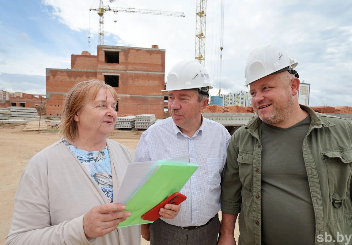 06-08-2025 Фото Антона Степанищева. Витебская область, Полоцк. Строительство поликлиники в микрорайоне №4 жилого района «Аэропорт». Галина Бельская, Александр Балобаев и Александр Литвинов