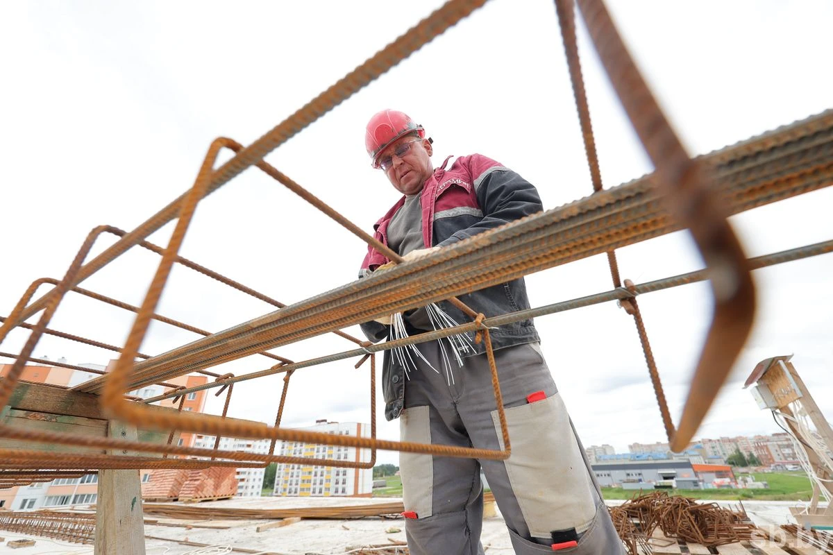 06-08-2025 Фото Антона Степанищева. Витебская область, Полоцк. Строительство поликлиники в микрорайоне №4 жилого района «Аэропорт». Монтажник Сергей Метла
