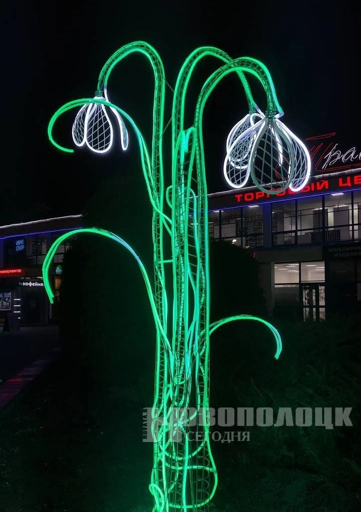 В Новополоцке к праздникам появилась новая декоративная композиция — у торгового центра «Пралеска» установили световые фигуры в виде подснежников. Необычная инсталляция сразу привлекла внимание прохожих и стала одним из самых обсуждаемых элементов новогоднего оформления города, пишет телеграм-канал газеты «Новополоцк сегодня».
